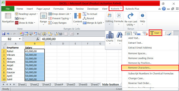 在功能区的数据集中,我们可以使用“查找和替换”对话框,它有多个选项可以删除数据中的特殊字符。用户使用逗号创建了员工的工资,需要以不同的方式进行删除。我们可以使用Ku-tools选项卡中的“删除字符”选项卡来一次性删除所有的逗号。他们必须从功能区中选择关键选项并更新数据。